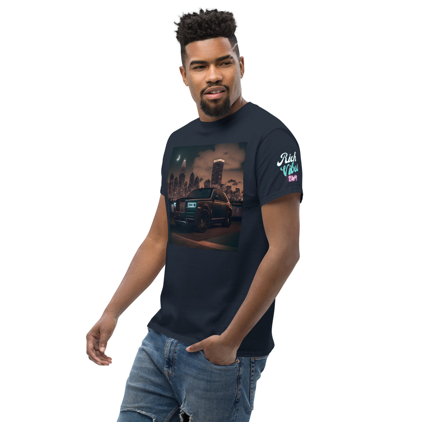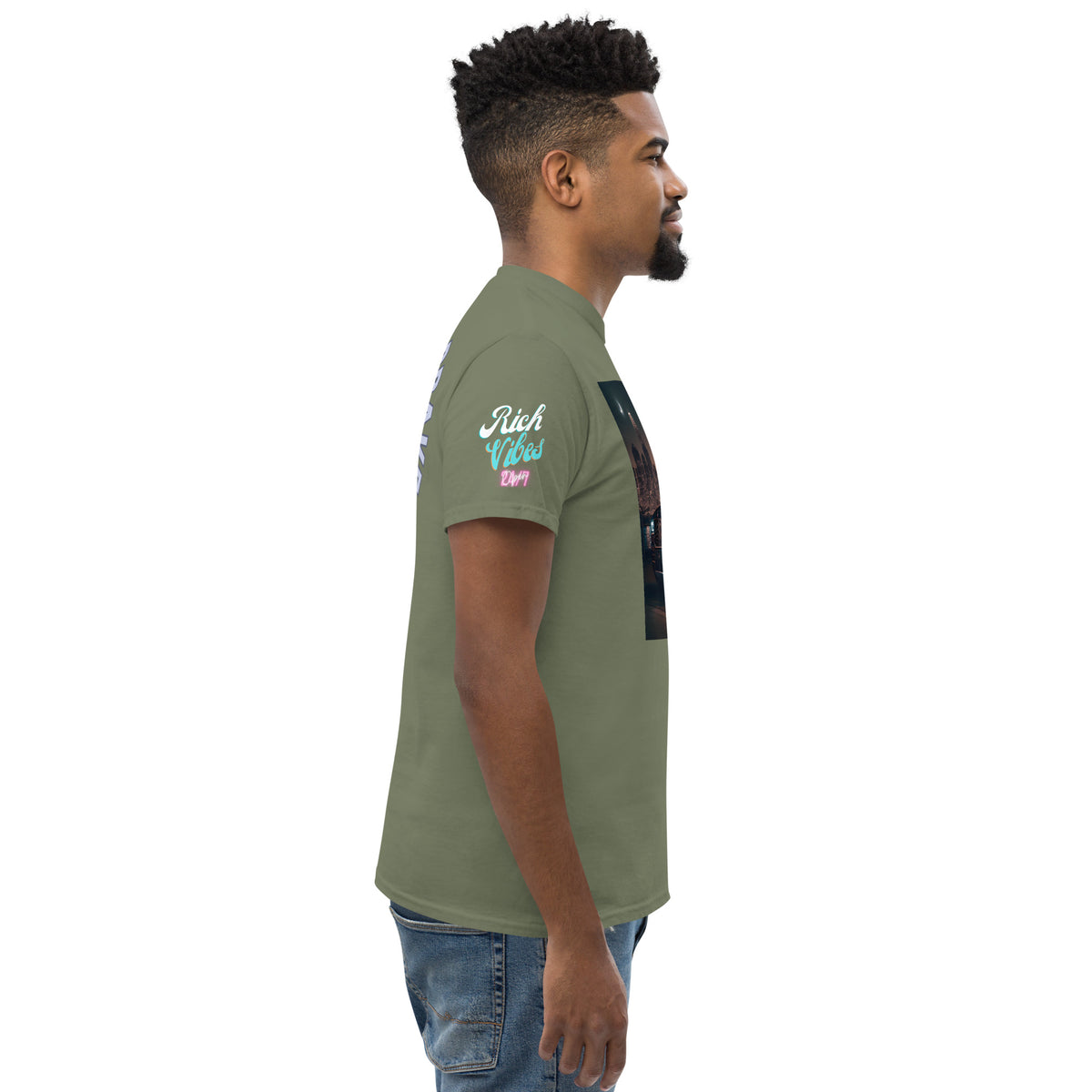 Rich Vibes Rolling Graphic T-Shirt featuring the Brand of the Brave on the back. This T-shirt is made of heavy cotton and fiber blends.